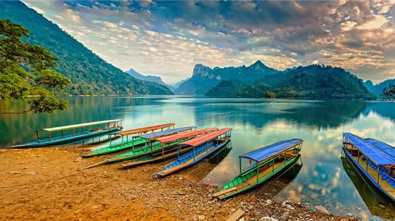 Hồ Ba Bể: Thuyền bập bềnh trên làn nước trong, khám phá thiên nhiên bí ẩn.