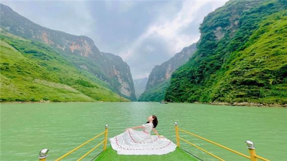 Đi thuyền trên sông Nho Quế ngắm hẻm Tu Sản kỳ vĩ từ dưới chân núi.