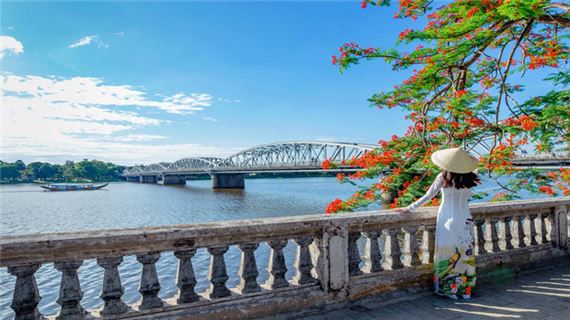 Ăn tối nhà hàng với đặc sản xứ Huế (Bánh bèo, lọc, nậm, khoái,...). Quý khách xuống thuyền Rồng để thưởng thức Ca Huế trên sông Hương, ngắm nhìn cầu Tràng Tiền bắc ngang qua dòng sông Hương.