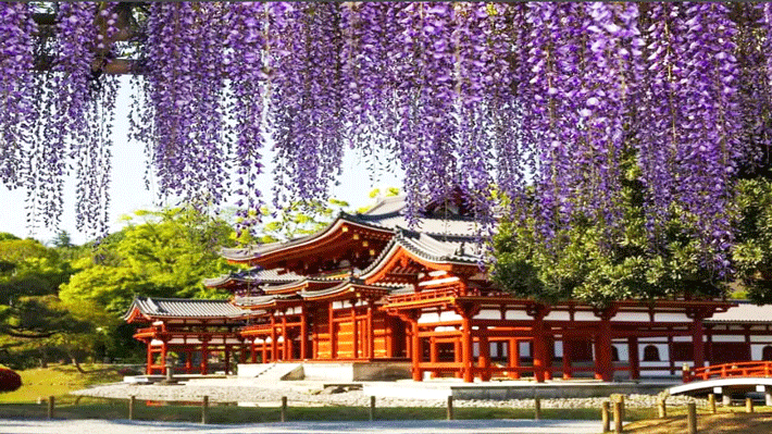 Tham quan đền Byodoin mùa hoa tử đằng cùng khung cảnh lãng mạn đặc trưng.