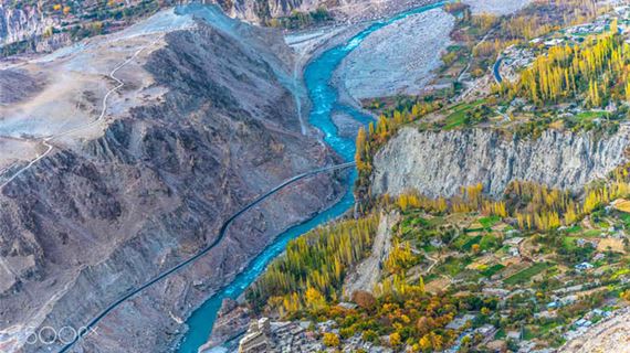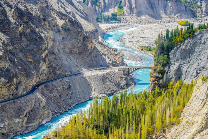 Đoàn lên xe khởi hành đến vùng Thượng Hunza, chúng ta sẽ bắt đầu đi trên cao tốc Karakoram, là cao tốc cao nhất trên thế giới, dài 1.290 km, được coi là kỳ quan thứ 8 của thế giới. Chuyến du hành trên cao tốc này mở ra trước mắt du khách cảnh quan thiên nhiên kỳ vỹ của Pakistan với những dãy núi hùng vỹ hai bên đường, những ngôi làng nhỏ xinh nằm bên dòng sông Indus uốn lượn mềm mại.