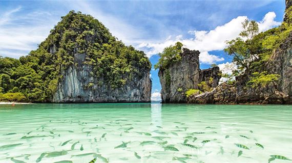 08h00: Xe đưa đoàn đến bến cảng, đi cano khám phá Vịnh Phang Nga - Check-in 5 hòn đảo nổi tiếng trong quần thể hơn 300 đảo đá vôi kỳ vĩ.