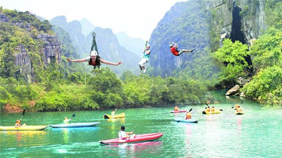 Tham quan Động Thiên Đường: di chuyển bằng xe điện và đi bộ dưới tán rừng nguyên sinh để đến với cửa hang động, sau đó là hành trình 1,2km chiều dài tham quan trong lòng hang động khô dài nhất Châu Á