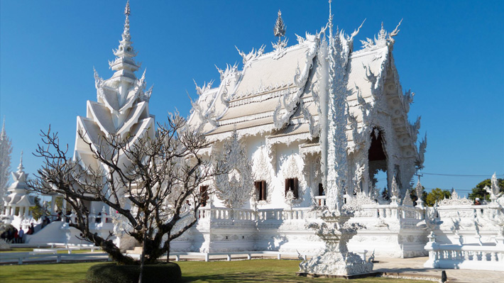Chùa Trắng - Wat Rong Khun: Toàn bộ ngôi chùa có một màu trắng nổi bật, độc đáo. Hoàn toàn khác biệt với những ngôi chùa trăm tuổi khác ở Chiang Rai, toàn bộ chùa đều được khoác lên mình một màu trắng là màu sắc tôn vinh trí tuệ thuần khiết của Đức Phật.