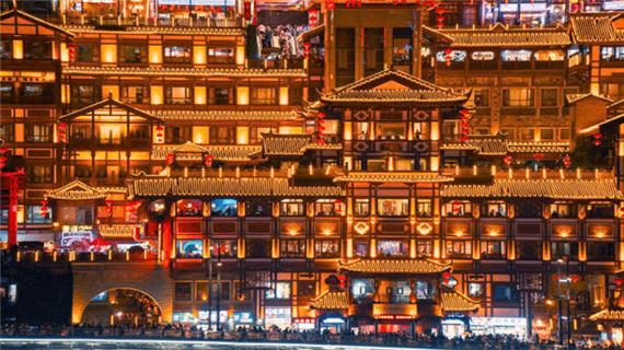 Hồng Nhai Động: Khu nhà sàn 11 tầng, cao 75 m, trên một vách đá dựng đứng tọa lạc dọc theo bờ sông Gia Lăng, đây là khu phức hợp với nhiều hàng quán thu hút khách du lịch và càng lộng lẫy hơn khi màn đêm buông xuống. Hồng Nhai Động luôn biết cách níu chân du khách thập phương, là điểm check-in cực hot khi đến Trùng Khánh.