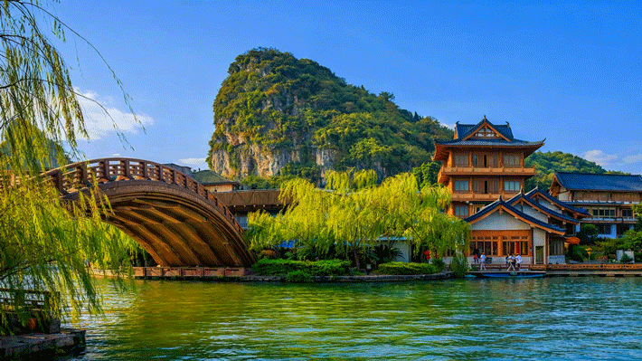 Hồ Mục Long: Hồ nhân tạo nổi bật với hố rồng gỗ, biểu tượng tạo nên tên gọi “Mộc Long” (Rồng Gỗ). Dưới sự bồi đắp của thiên nhiên, nơi đây ngày càng thêm thơ mộng và gắn liền với giá trị lịch sử, văn hóa đặc sắc của Quế Lâm, Quảng Tây.