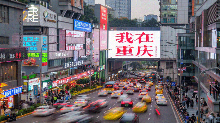 Phố Quan Âm Kiều - Cứ khoảng 14 phút sẽ có đếm ngược “3, 2, 1”, rồi xuất hiện dòng chữ (我在重 - Tôi đang ở Trùng Khánh) trên màn hình lớn. Đây là thiên đường ẩm thực địa phương với vô vàn món ngon nổi tiếng ở Trùng Khánh.