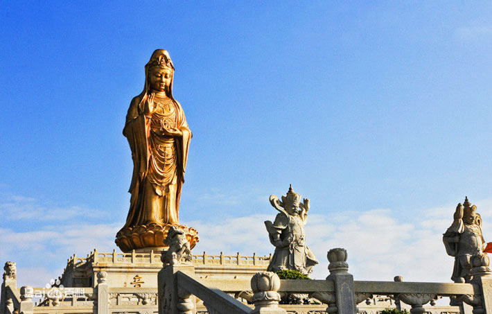 Tượng Bồ Tát Quán Âm Nam Hải - biểu tượng thiêng liêng và nổi tiếng nhất của thánh địa Quan Âm Trung Hoa. Tượng bằng đồng cao 33m, du khách có thể chiêm ngưỡng được từ nhiều nơi. Tượng có 2 tầng, tầng dưới phía trong có 4 bức phù điêu đồng với câu chuyện truyền thuyết về đức bồ tát Quan Âm, tầng trên có 500 tượng Quan Âm mỗi vẻ mỗi dáng khác nhau.