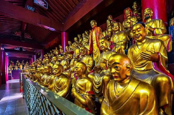 Ngũ Bách La Hán Đường - nơi tôn thờ 500 pho tượng La Hán, mỗi pho tượng mang một thần thái và dáng vẻ khác nhau, tạo nên khung cảnh trang nghiêm và ấn tượng. Điểm đặc biệt nhất nơi đây nổi tiếng với câu nói “Một bước một cảnh, một tượng một tâm”. Ngoài ra, đây còn được xem là một trong những công trình đặc trưng nhất của núi Cửu Hoa.