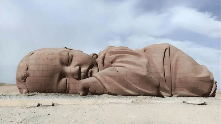 Đại Địa Chi Tử (Đứa con của Trái Đất): Tác phẩm là hình ảnh một em bé khổng lồ đang nằm sấp, ngủ ngon lành giữa sa mạc mênh mông với chiều dài 15m, cao 4.3m, rộng 9m. Nhìn từ trên cao tựa như đứa con của đất mẹ, càng đến gần càng cảm thấy chấn động! Giữa vùng đất hoang vu rộng lớn, một em bé với thần thái an nhiên đang nằm úp mặt, tựa như đang yên giấc trong lòng mẹ.