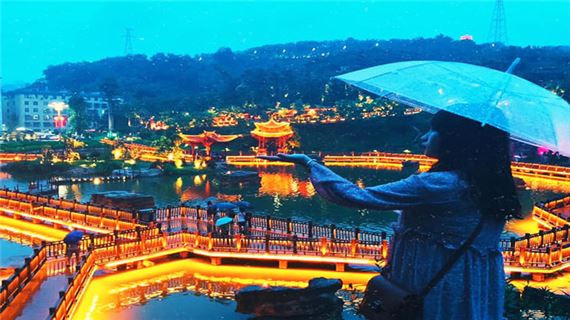 Quý khách tự túc xe điện/taxi đến Công viên Ánh Sáng (Lân Sơn). Khi đêm xuống, công viên rực rỡ ánh đèn, tái hiện không gian cổ trang Trung Hoa bên hồ nước trong veo, tạo nên khung cảnh lung linh và lãng mạn như Cổ Trấn.
