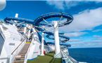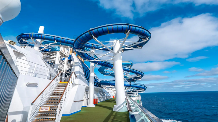 Công viên nước ngoài trời với hệ thống ống trượt nước đa dạng, uốn lượn quanh boong tàu với nhiều cấp độ từ nhẹ nhàng đến cảm giác mạnh.
